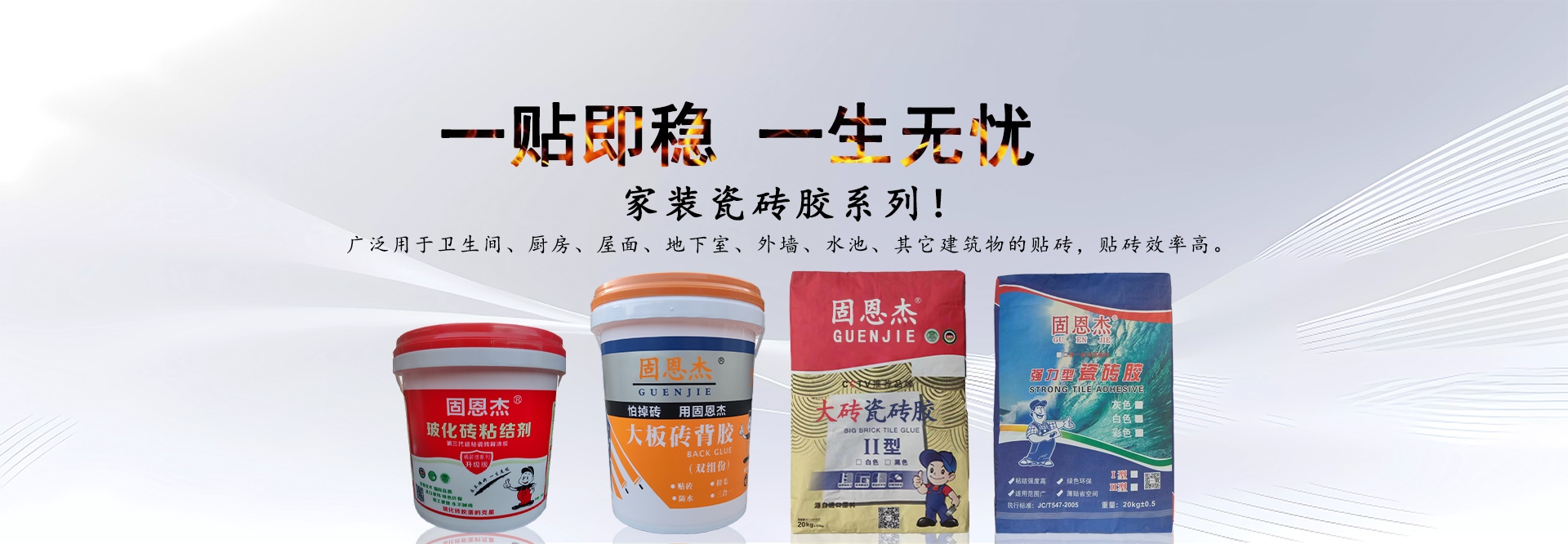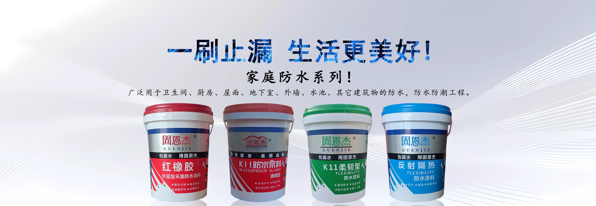 廣州固恩杰防水建材科技有限公司(簡稱:固恩杰)是集研發(fā)、生產、銷售于一體的高新技術建筑材料制造企業(yè),與多個國際知名化工企業(yè)建立良好穩(wěn)定的戰(zhàn)略合作伙伴關系,公司目標是打造中國最具競爭力的防水品牌 。公司產品具有質量穩(wěn)定可靠、耐久性好、綠色環(huán)保、對人體健康無毒害作用、使用方便、粘結力強、耐候性好、提高工程質量、降低工程造價等優(yōu)勢,是提升人們居住環(huán)境質量的換代產品,廣泛應用于新舊商住樓,賓館會所、辦公樓寓的室內外裝修工程。